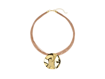 Colar de biojoias confeccionado em palha de Buriti e metal banhado a ouro, que combina um design moderno com a essência das joias sustentáveis.